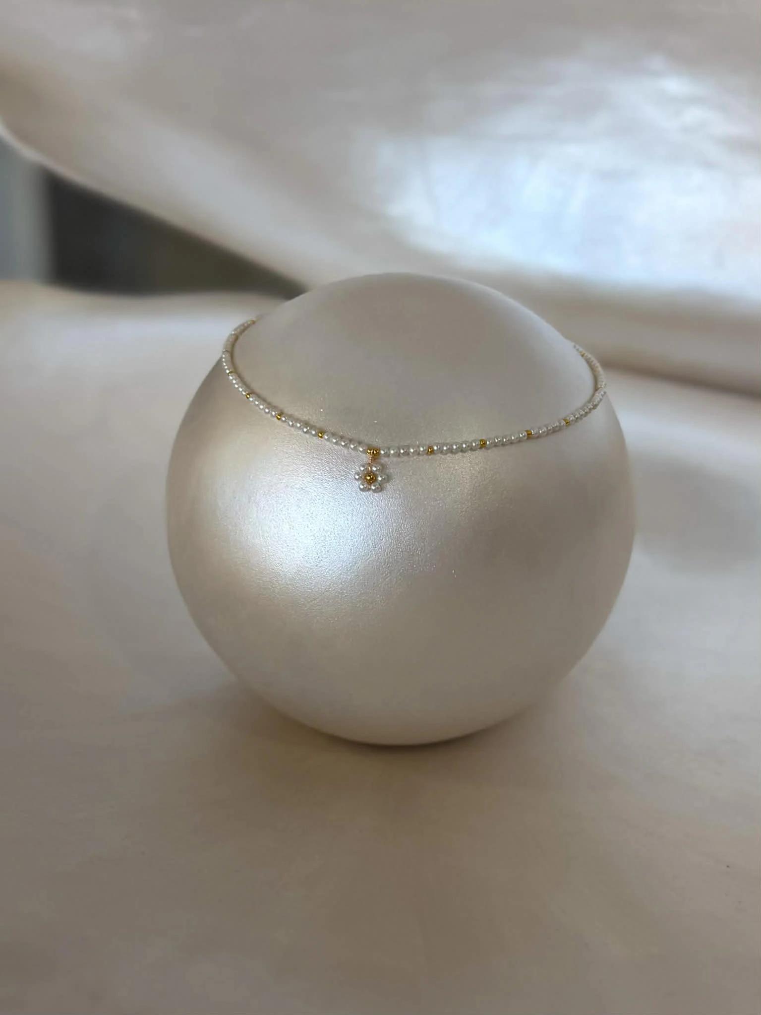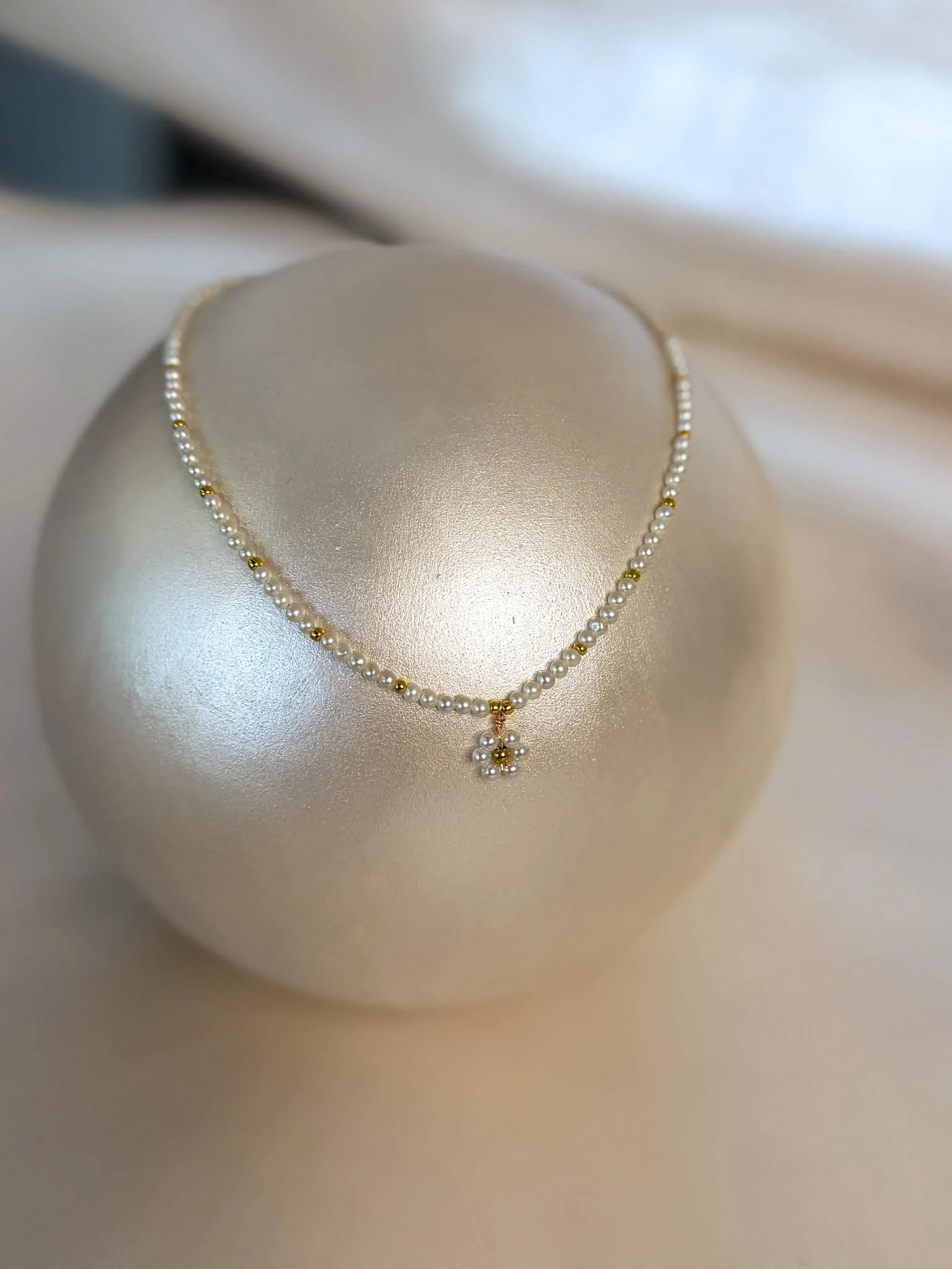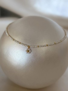 Wyrafinowany naszyjnik wykonany z drobnych, naturalnych pereł, subtelnie przełamanych złotymi akcentami i zwieńczony minimalistycznym kwiatem. T
